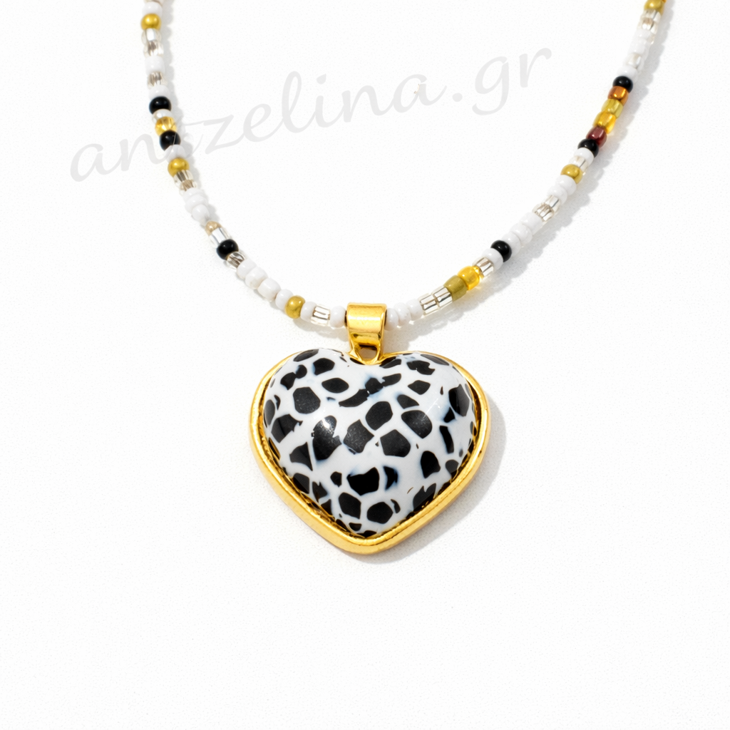Η καρδιά με άσπρο animal print σχέδιο προσθέτει φωτεινή αντίθεση και statement χαρακτήρα, ενώ οι χάντρες ολοκληρώνουν το look με ισορροπία και παιχνιδιάρικη διάθεση.