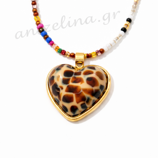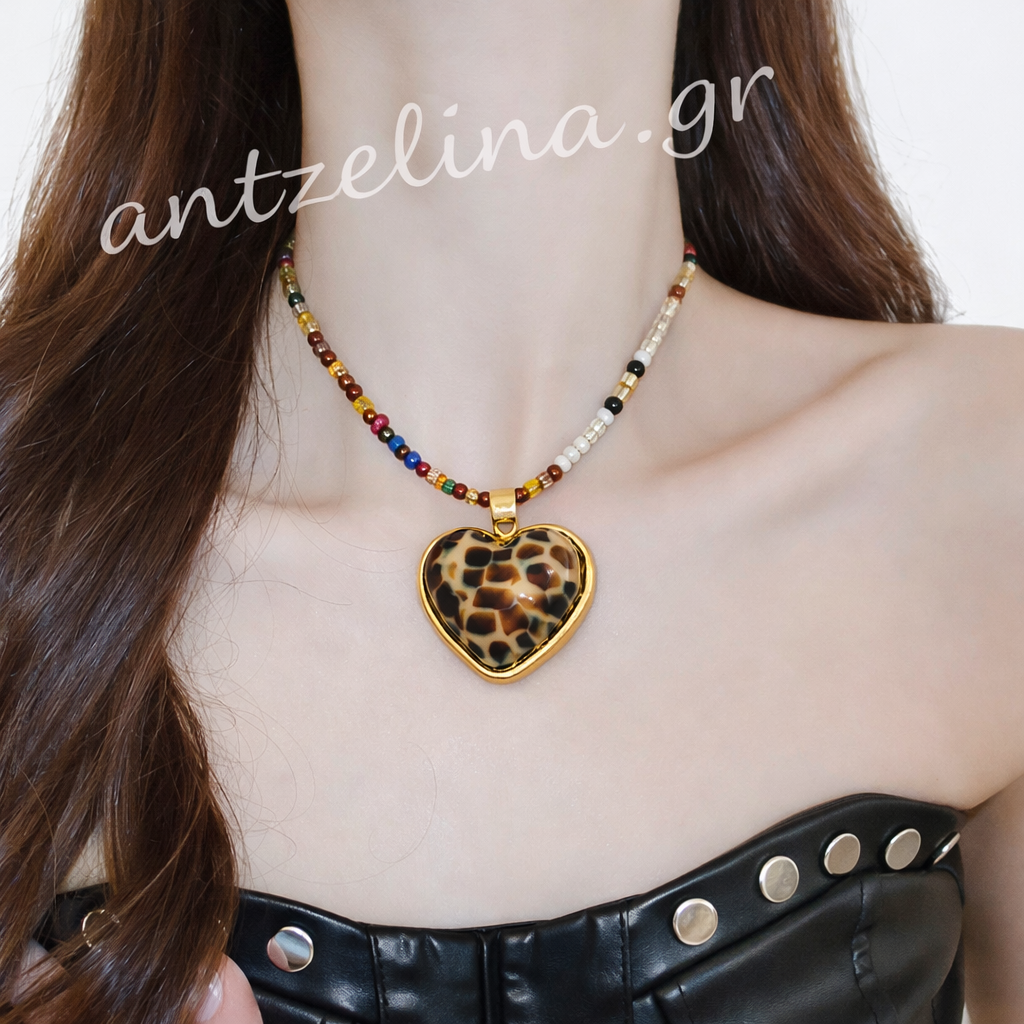 Ένα Κολιέ Χάντρες & Καρδιά Animal καφέ print καρδιά σε χρυσό τόνο που δίνει ένταση, προσωπικότητα και σύγχρονο χαρακτήρα σε κάθε σας εμφάνιση.