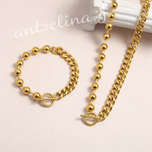 Ένα χρυσό Κολιέ Μπίλιες & Αλυσίδα από ατσάλι που προσθέτει διακριτική λάμψη και διαχρονικό στυλ σε κάθε σας εμφάνιση.