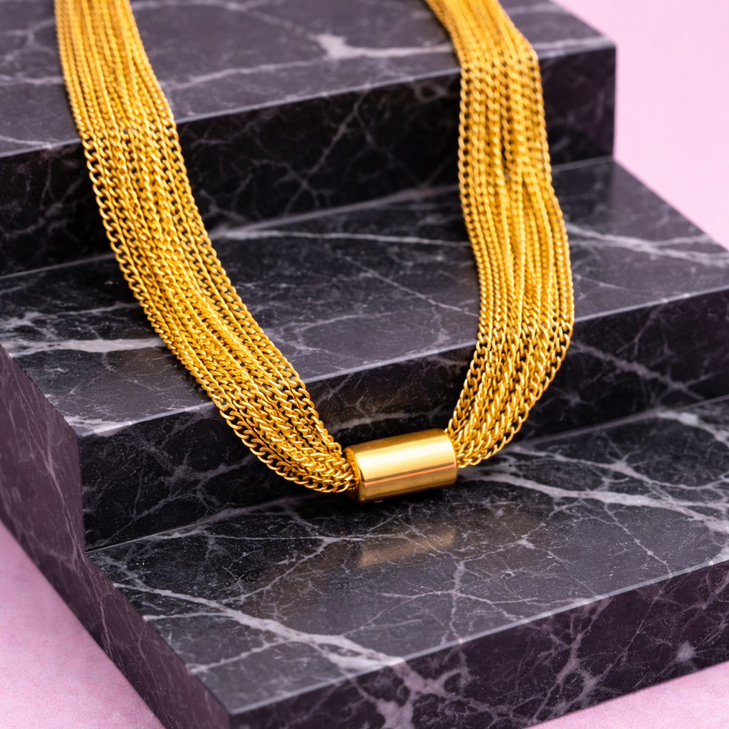 Κατασκευασμένο από υψηλής ποιότητας ανοξείδωτο ατσάλι, το κολιέ είναι ανθεκτικό στη φθορά, δεν μαυρίζει και δεν αλλοιώνεται, καθιστώντας το ιδανικό για καθημερινή χρήση. Η χρυσή απόχρωση του χαρίζει πολυτέλεια, ενώ το πολύσειρο σχέδιο αγκαλιάζει όμορφα τον λαιμό, προσφέροντας κομψότητα και δυναμικό χαρακτήρα.