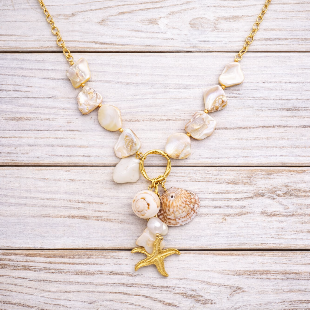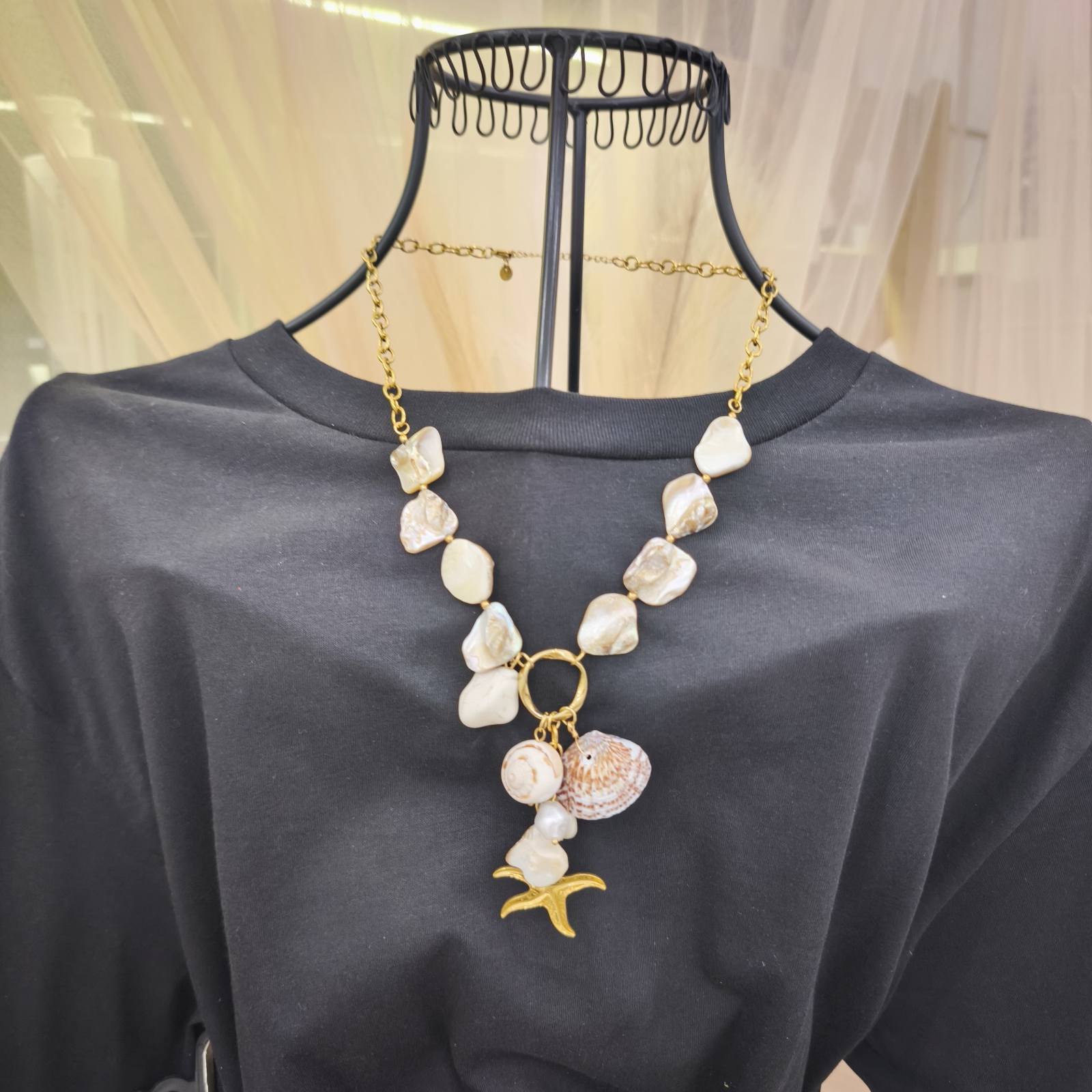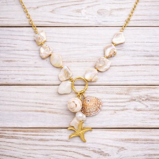 Τα διακοσμητικά κοχύλια και ο αστερίας δημιουργούν ένα αρμονικό θαλασσινό σχέδιο, αποπνέοντας ανεμελιά και κομψότητα. Η χρυσή απόχρωση προσδίδει πολυτέλεια, ενώ το κολιέ φοριέται άνετα τόσο μόνο του όσο και σε layering με άλλα καλοκαιρινά κοσμήματα.