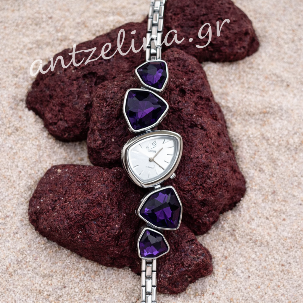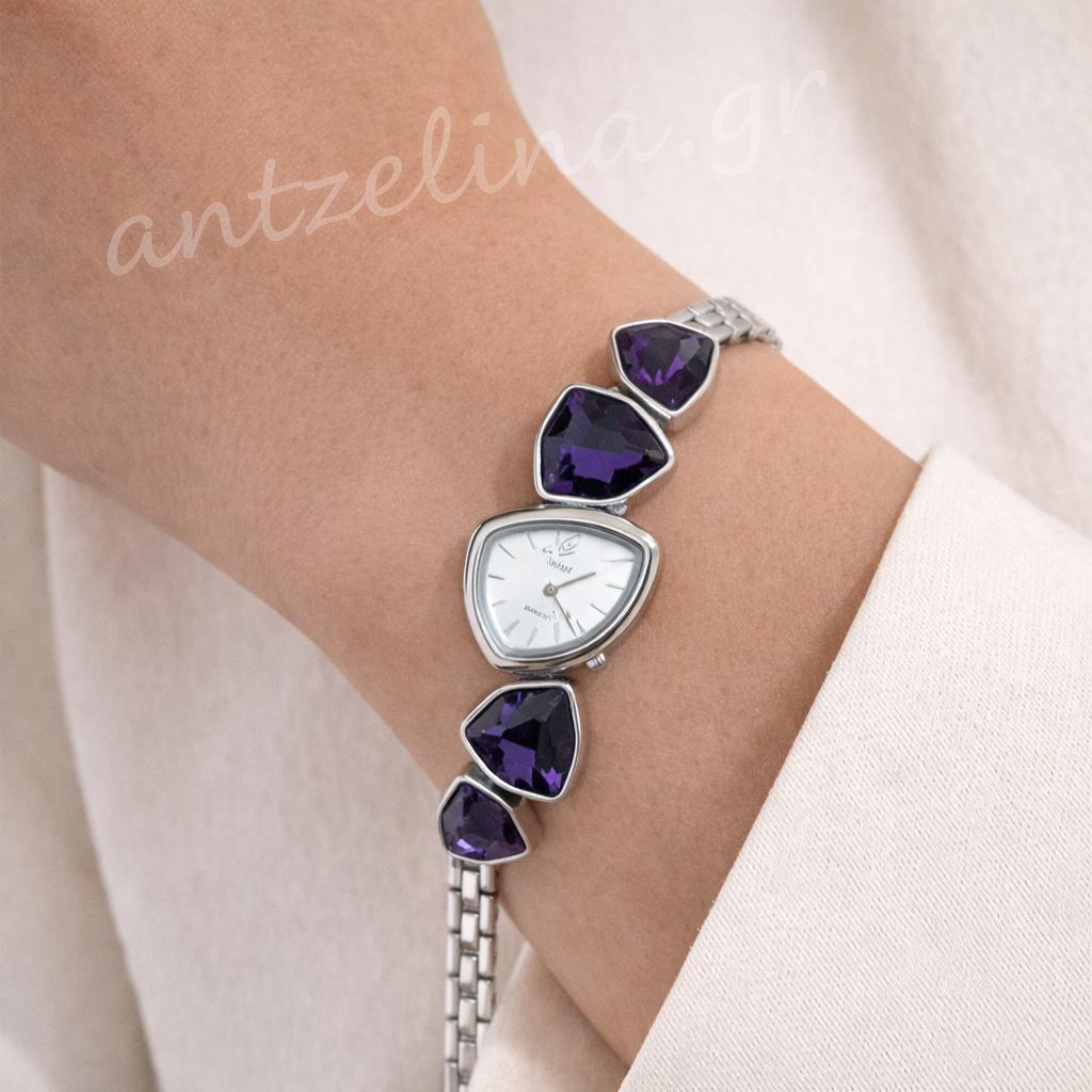 Ένα ασημί Ρολόι Βραχιόλι Λιλά Διαμαντάκια που προσθέτει χρώμα, λάμψη και διακριτική πολυτέλεια σε κάθε σας εμφάνιση.