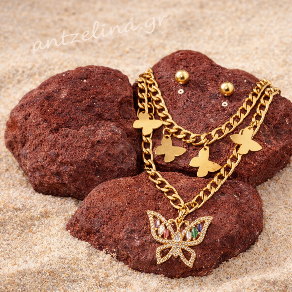 Σετ Κολιέ Σκουλαρίκια Πεταλούδα χρυσό από ανοξείδωτο ατσάλι με πολύχρωμες πέτρες. Ένα κόσμημα γεμάτο χρώμα και συμβολισμό, καθώς η πεταλούδα εκφράζει την ελευθερία, την ανανέωση και τη θετική ενέργεια.