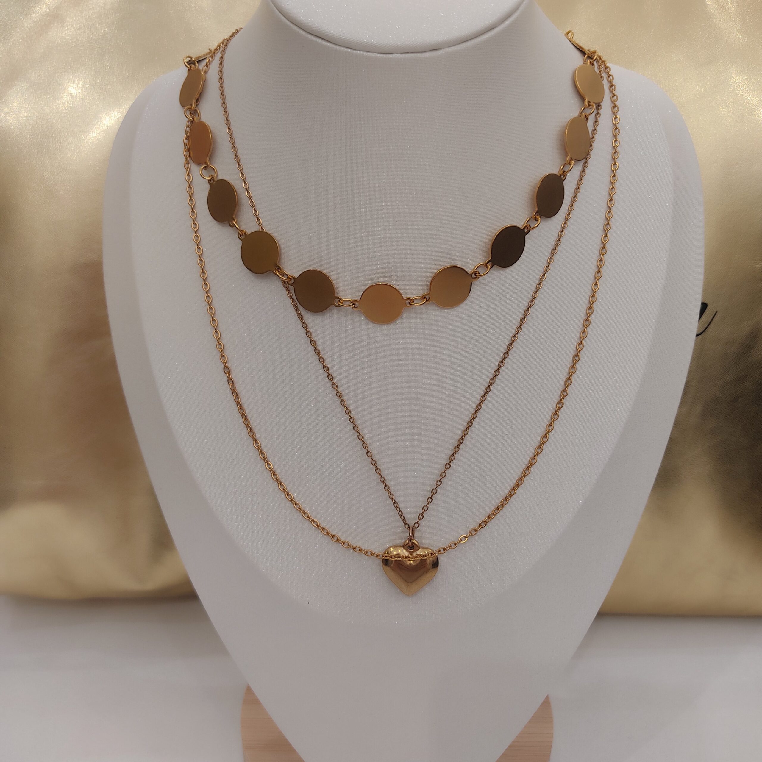 Ανάδειξε την κομψότητα και τη μοναδικότητά σας με αυτό το τρίσειρο κολιέ από ανοξείδωτο ατσάλι σε χρυσή απόχρωση. Διακοσμημένο με καρδιά και φλουριά. Ο συνδυασμός των τριών στοιχείων δημιουργεί ένα layering effect που προσφέρει μοντέρνο. Πολυδιάστατο στυλ και ιδανική ισορροπία μεταξύ minimal και statement κοσμήματος.