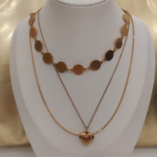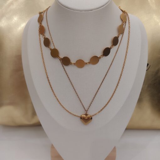 Ανάδειξε την κομψότητα και τη μοναδικότητά σας με αυτό το τρίσειρο κολιέ από ανοξείδωτο ατσάλι σε χρυσή απόχρωση. Διακοσμημένο με καρδιά και φλουριά. Ο συνδυασμός των τριών στοιχείων δημιουργεί ένα layering effect που προσφέρει μοντέρνο. Πολυδιάστατο στυλ και ιδανική ισορροπία μεταξύ minimal και statement κοσμήματος.
