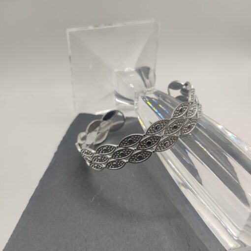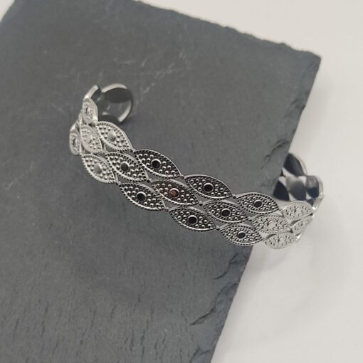 Οι χειροπέδες μας είναι μια εντυπωσιακή επιλογή για να προσθέσετε λάμψη και στυλ στην εμφάνισή σας. Κατασκευασμένες από ανθεκτικό ατσάλι και επικαλυμμένες με ασημί χρώμα, αυτές οι χειροπέδες συνδυάζουν την αντοχή με την κομψότητα. Το μοναδικό σχέδιο των ματιών προσδίδει μια μυστηριώδη και εντυπωσιακή πινελιά στο κόσμημά σας. Ενώ ταυτόχρονα αναδεικνύει την κομψότητα και το στυλ σας. Ιδανικές για καθημερινή ή επίσημη εμφάνιση. Αυτές οι χειροπέδες αποτελούν ένα εντυπωσιακό κοσμηματικό αξεσουάρ που θα κλέψει τις εντυπώσεις σε κάθε περίσταση.
