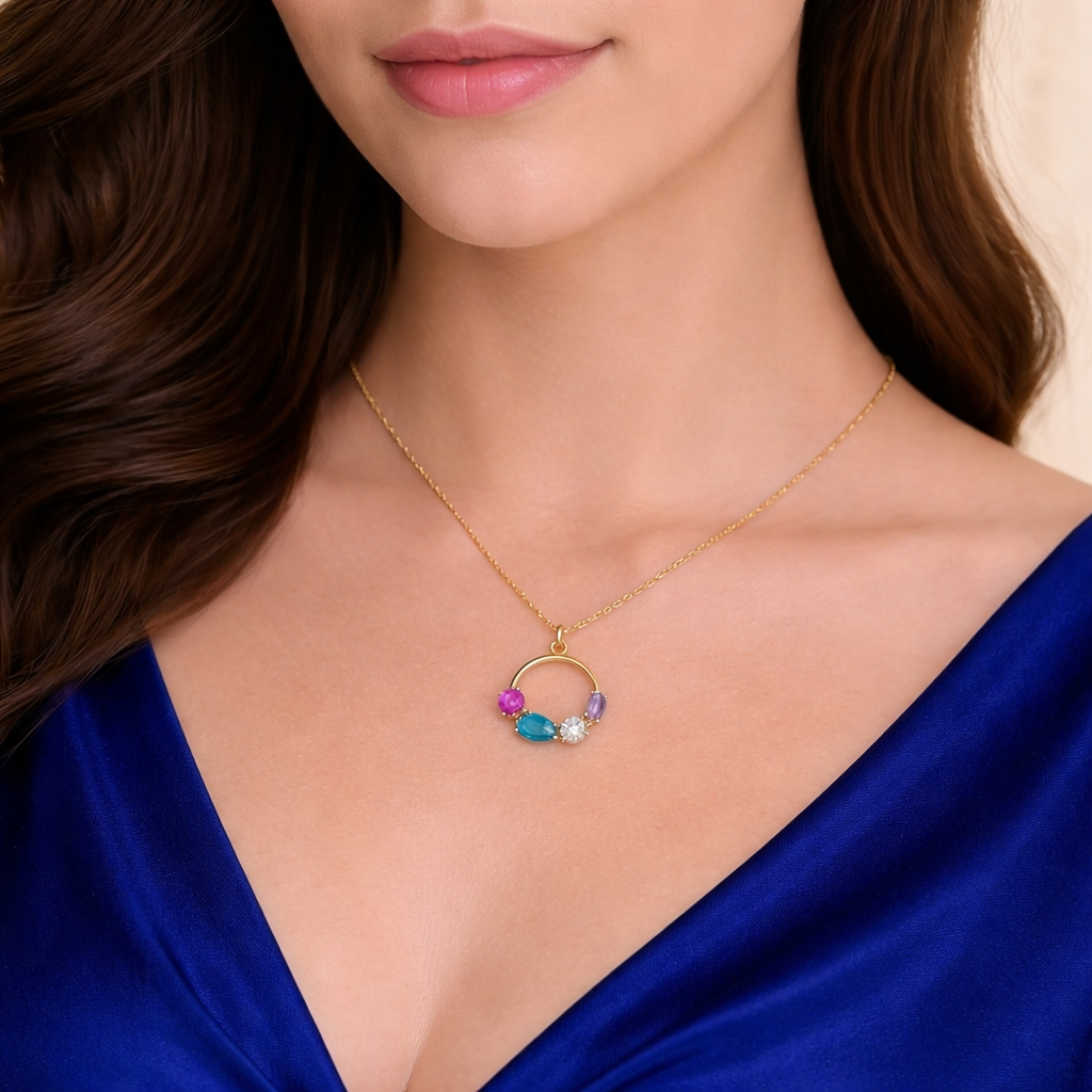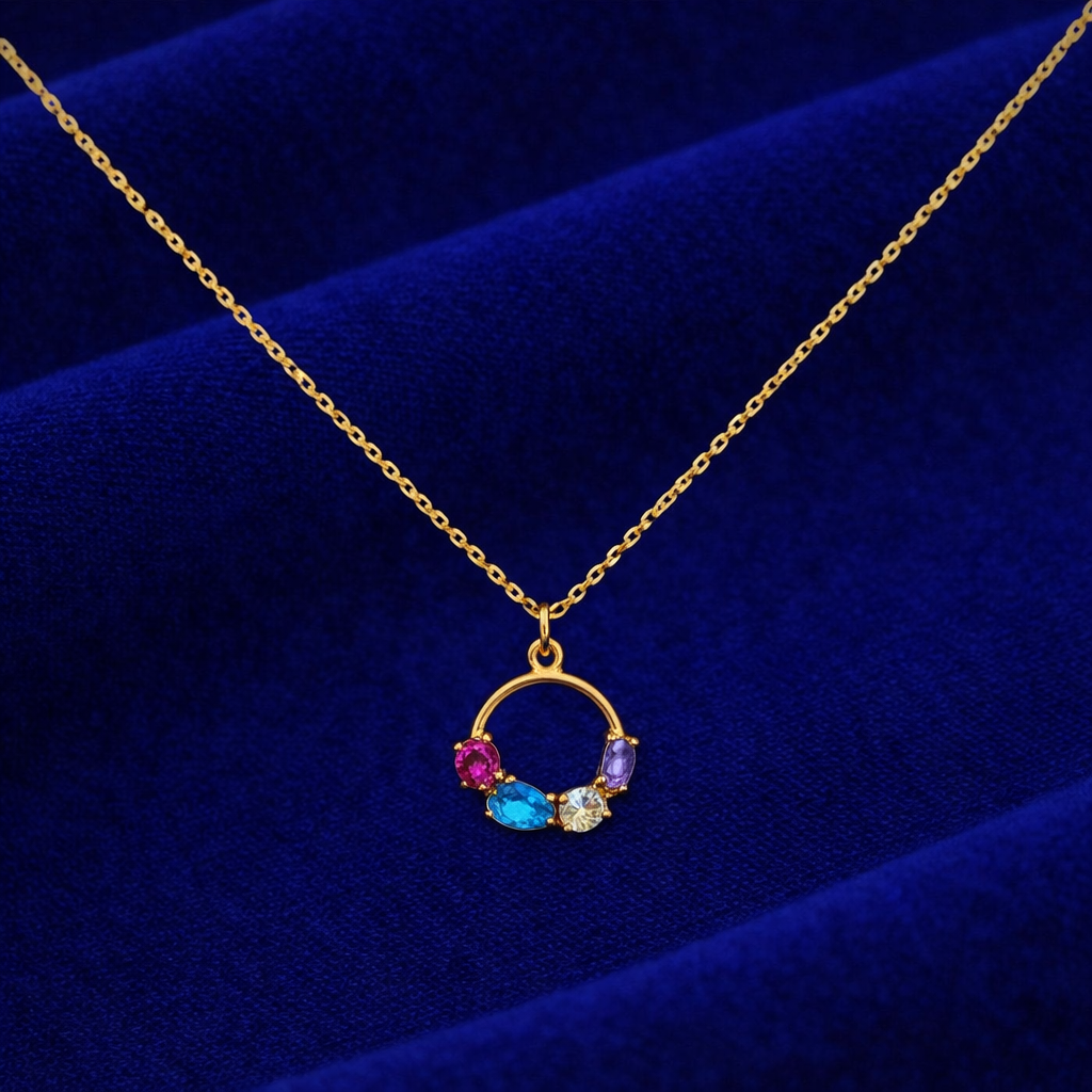 Κατασκευασμένο από γνήσιο ασήμι 925 με επιχρύσωση. Το κολιέ διαθέτει μια σειρά από πολύχρωμες πέτρες που προσδίδουν λάμψη και χρώμα στο κολιέ.