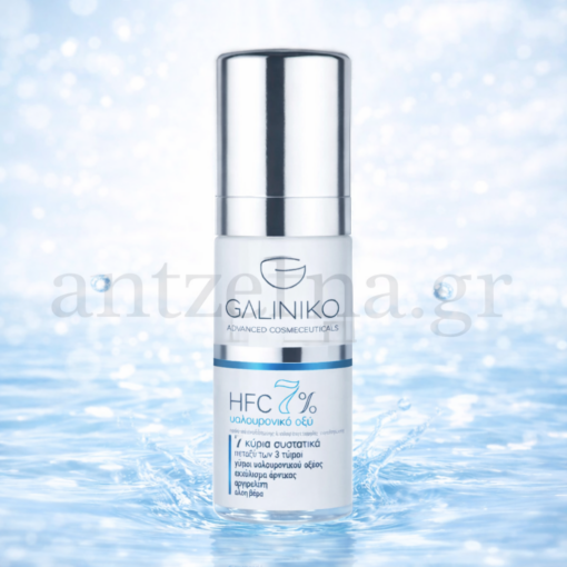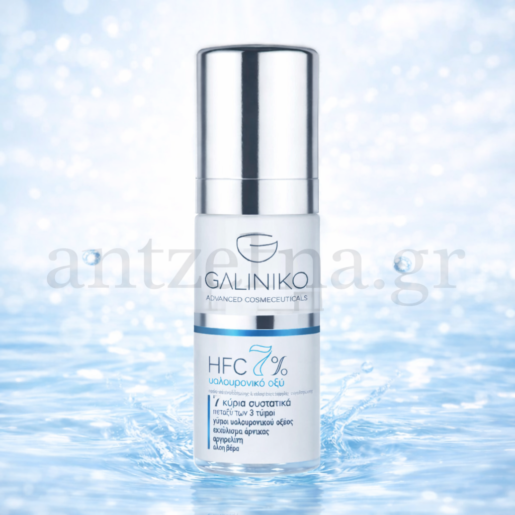 Αντιγηραντικός – Ενυδατικός ορός Galiniko HFC 7% Υαλουρονικό Οξύ 30mL. Μία έκρηξη ενυδάτωσης και αντιγήρανσης με τεχνολογία εμπνευσμένη από δερματολογικά ενέσιμα προϊόντα. Ο ορός υαλουρονικού οξέος 7% HFC της Galiniko, περιλαμβάνει 7 κύρια συστατικά που προσφέρουν σύσφιξη και στιγμιαίο lifting effect στην επιδερμίδα, ενώ συμβάλλει στην αντιμετώπιση ρυτίδων και λεπτών γραμμών. Οι τρεις μορφές υαλουρονικού οξέος εκτοξεύουν την παραγωγή κολλαγόνου και ενυδατώνουν σε βάθος την επιδερμίδα. (Aloe Vera, Κολλαγόνο, Υαλουρονικό Οξύ).