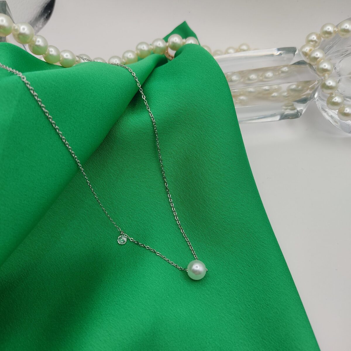 Αυτό το όμορφο κολιέ συνδυάζει την κομψότητα της πέρλας με τη λάμψη ενός διαμαντιού. Κατασκευασμένο από ανθεκτικό ατσάλι με ασημί φινίρισμα, το κολιέ διαθέτει μια λαμπερή πέρλα στο κέντρο της οποίας αναδεικνύεται ένα μικρό διαμαντάκι. Η διακριτική λάμψη του διαμαντιού συνδυάζεται υπέροχα με την κομψότητα της πέρλας, προσθέτοντας μια μοναδική αίσθηση πολυτέλειας σε κάθε εμφάνιση
