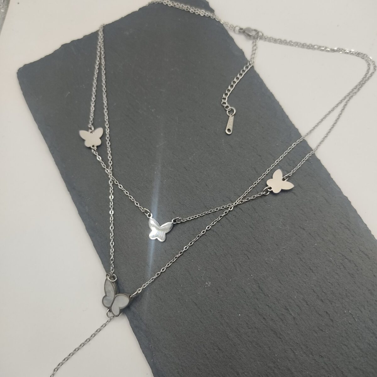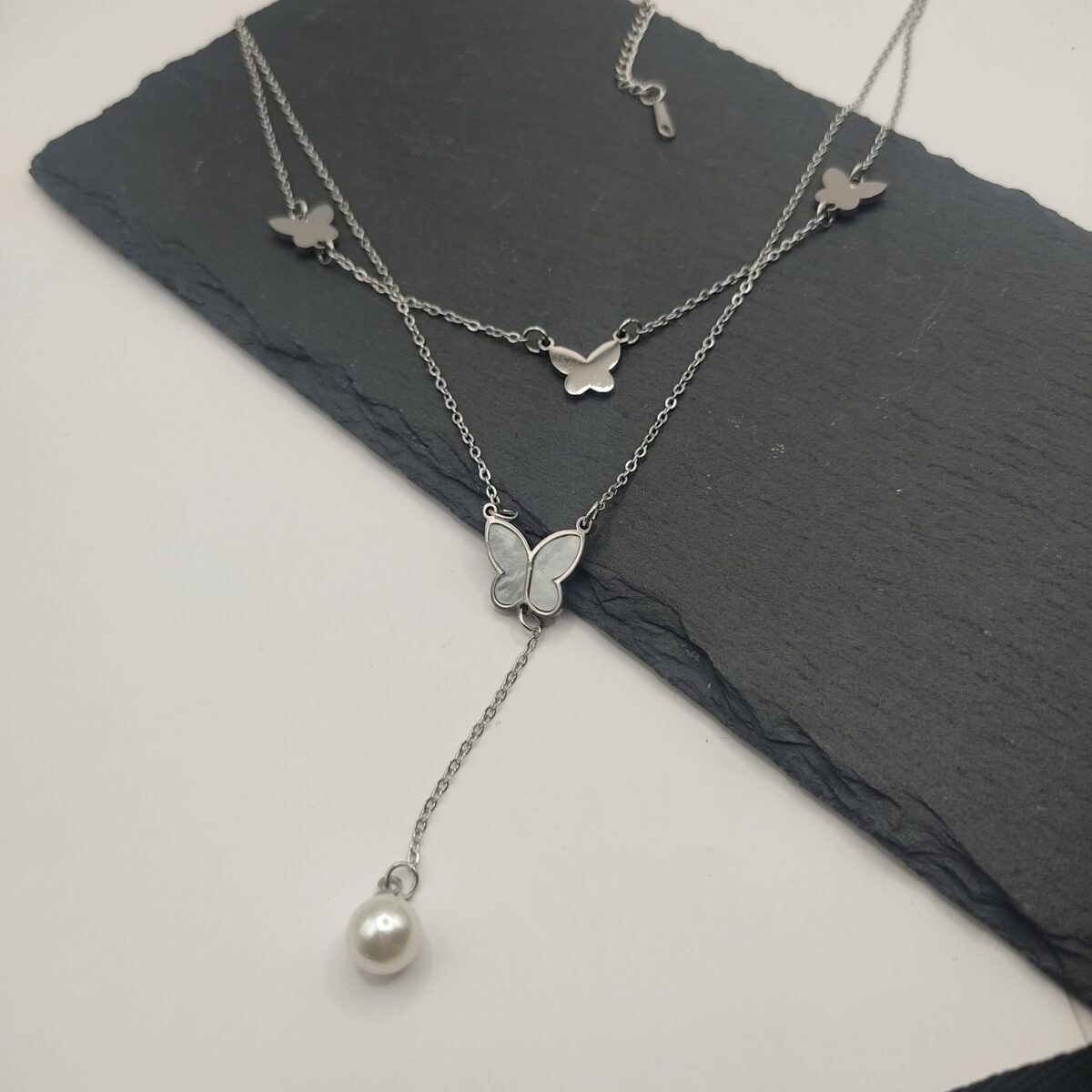 κολιέ ατσάλι ασημί πεταλούδες φίλντισι δύσειρο πέρλα
