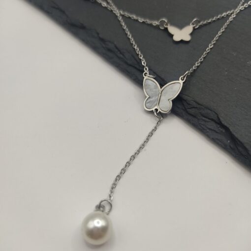 κολιέ ατσάλι ασημί πεταλούδες φίλντισι δύσειρο πέρλα