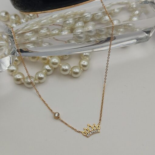 Αυτό το κολιέ αποπνέει μια αίσθηση βασιλικής κομψότητας και λάμψης. Με την παρουσία μιας χρυσής κορώνας διακοσμημένης με στρας και ένα μικρό διαμαντάκι. Η χρυσή απόχρωση του ατσαλιού προσδίδει πολυτέλεια και λάμψη. Ενώ τα στρας προσθέτουν μια δόση λάμψης και φωτεινότητας. Η κορώνα είναι ένα σύμβολο εξουσίας και ευγένειας. Κάνοντας αυτό το κολιέ μια εντυπωσιακή επιλογή για ειδικές περιστάσεις ή για να φορεθεί καθημερινά με στυλ και κομψότητα.