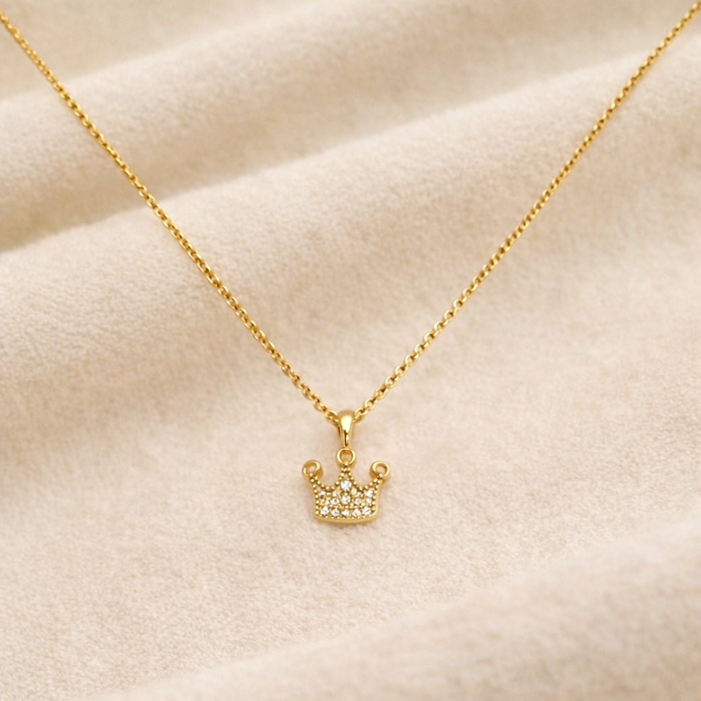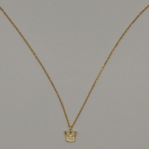 Αυτό το κολιέ αποτελεί μια λαμπερή και εντυπωσιακή επιλογή που θα ξεχωρίσει στο λαιμό σας. Κατασκευασμένο από γνήσιο ασήμι 925 με επιχρύσωση χρυσής απόχρωσης. Η κορώνα διαθέτει λεπτομερή σχέδια που προσδίδουν μια αίσθηση βασιλικής κομψότητας και γοητείας. Η χρυσή απόχρωση προσθέτει μια ζεστή λάμψη και φινέτσα στο κολιέ. Δημιουργώντας ένα μοναδικό και εντυπωσιακό αποτέλεσμα. Αυτό το κολιέ είναι κατάλληλο για κάθε περίσταση και θα προσδώσει μια μοναδική πινελιά βασιλικής γοητείας και κομψότητας στο στυλ σας.