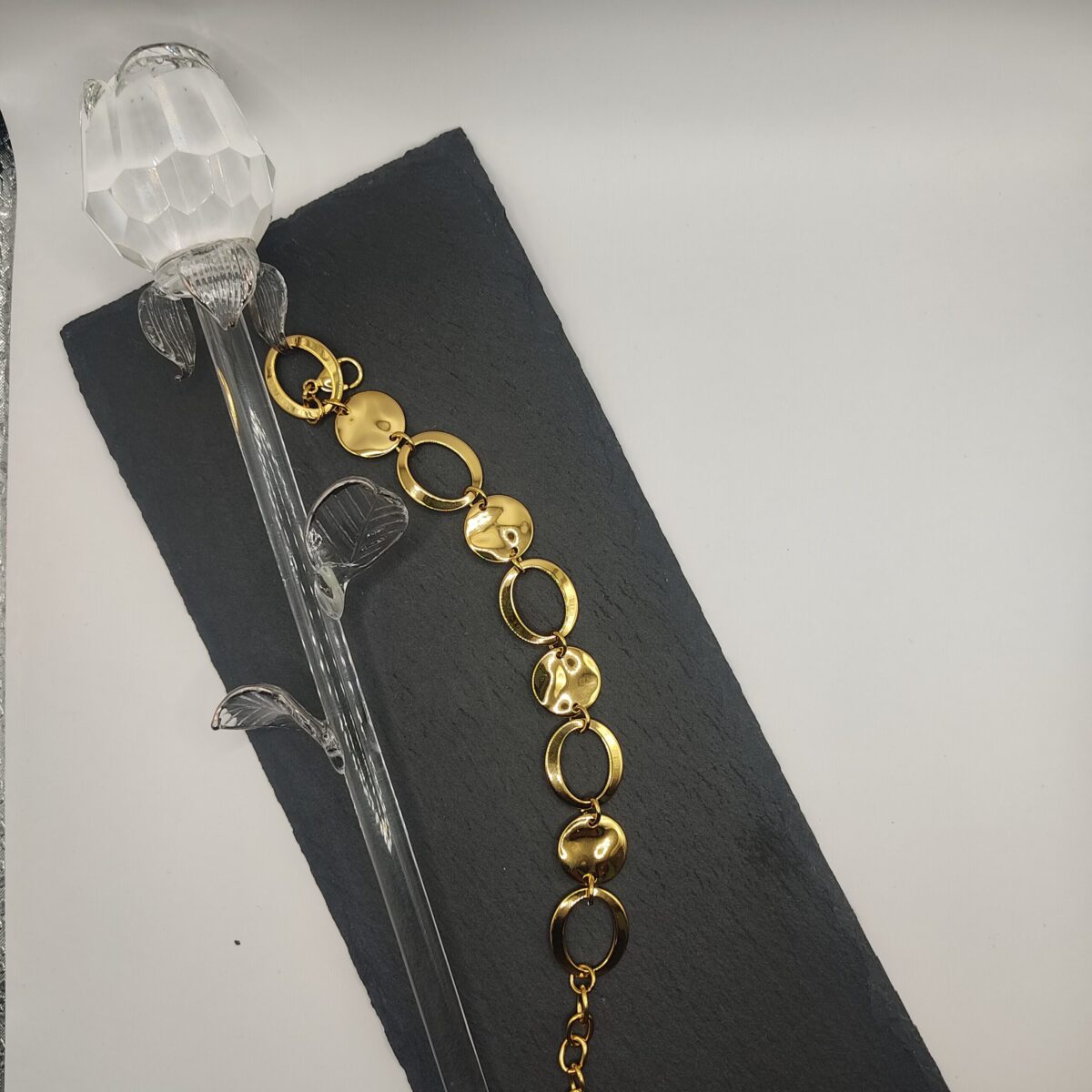 Το βραχιόλι μας αποτελεί μια λαμπερή και κομψή επιλογή για να αναδείξετε το στυλ σας. Κατασκευασμένο από ανθεκτικό ατσάλι με χρυσό φινίρισμα, το σφυρήλατο σχέδιο του δημιουργεί ένα μοναδικό και εντυπωσιακό αποτέλεσμα. Με την λαμπερή του εμφάνιση και την κομψότητά του, αυτό το βραχιόλι προσθέτει μια διακριτική πινελιά πολυτέλειας σε κάθε εμφάνιση. Ιδανικό για καθημερινή χρήση ή για ειδικές περιστάσεις, αυτό το βραχιόλι θα αναβαθμίσει το στυλ σας με κομψότητα και λάμψη.